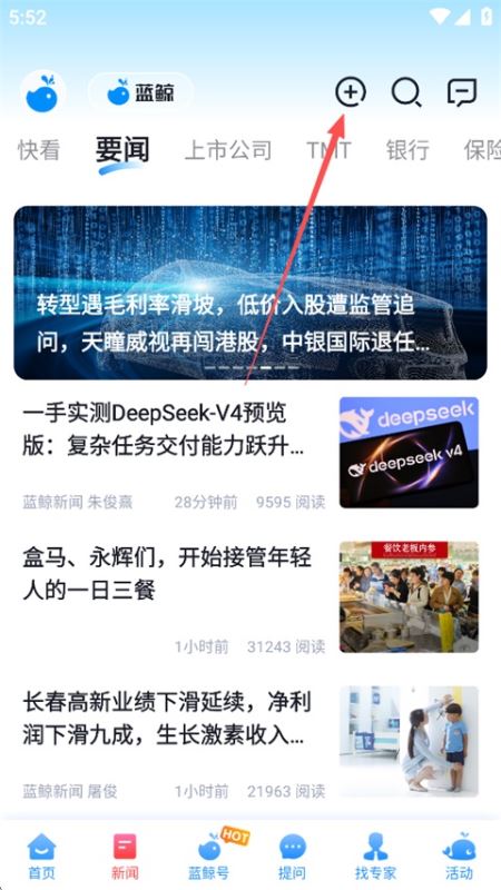 1、注册登录好蓝鲸财经app之后,点击右上角符号;