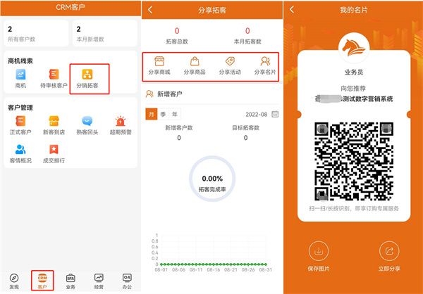 业务员可通过-分享商城/分享商品/分享活动/分享名片-这四种方式分享给客户、客户通过业务员的链接注册之后会自动归居到这个业务员名下