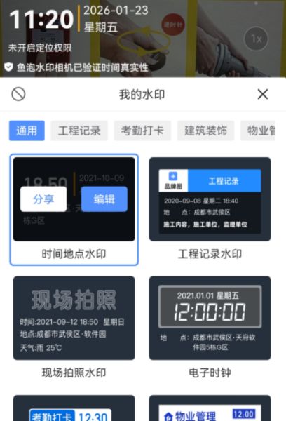 2、水印样式分为工程记录、考勤打卡、建筑装饰以及物业管理等。点击水印上方会出现水印预览,还可以编辑。