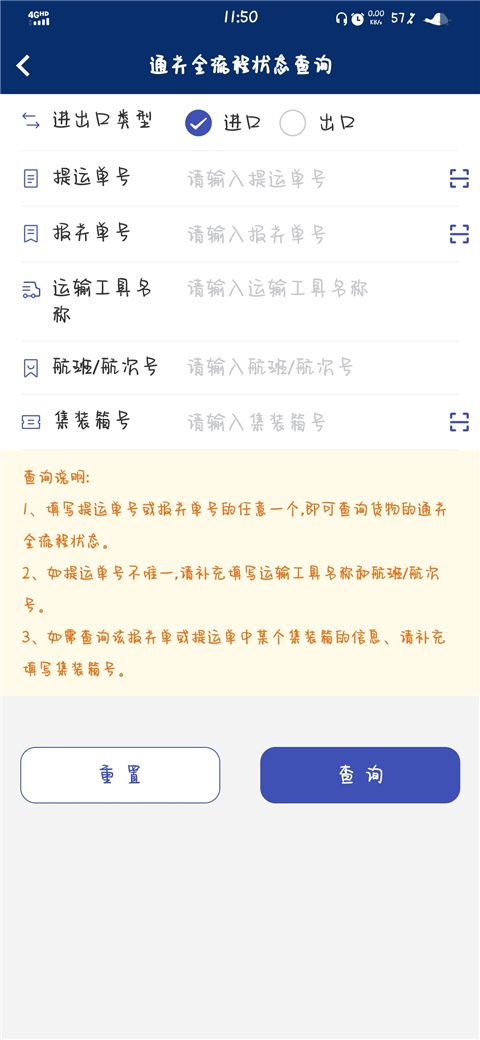 进入通过状态查询页面后,输入提运单号、报关单号等信息,然后点击【查询】功能。