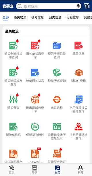 2、【办事】页面为用户提供了各种各样的事项办理业务,例如运输工具类、货物通关类、物品通关类等。