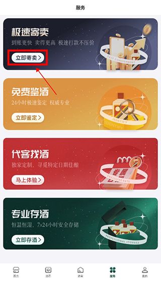 1、用户如果想要进行酒水的寄卖,可以点击屏幕下方的服务,再点击极速寄卖。