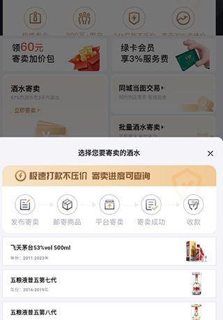 3、之后选择自己要寄卖的酒水种类,目前只提供飞天茅台53%vol500m以及五粮液普五第七、第八代寄卖服务。