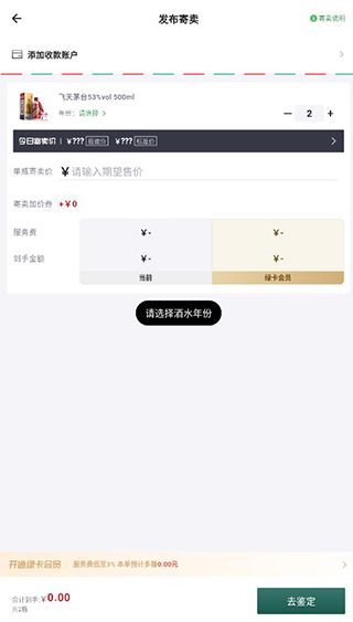 4、选择完酒水之后,进入发布寄卖界面,填写好收款账号,售价以及酒水年份,再点击下方去鉴定。