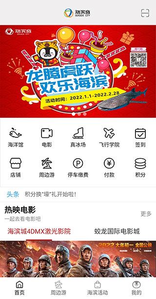 1、【首页】:进入海滨城app首页,我们可以看到一些常用的功能,如海洋馆、电影、签到、付款和积分等。