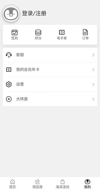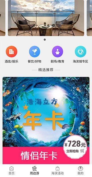 2、【周边游】:此页面为用户们推荐了一些比较优惠的出游方案,既有餐饮好物类,也有海滨城专区类。