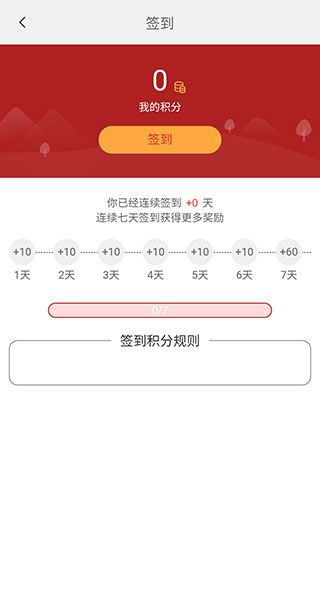 2、【积分商城】由于是不定时刷新,所以我们这次什么也没有看到,小编现在也为大家找到了获取积分的方式,一是【签到】,连续签到积分更多。