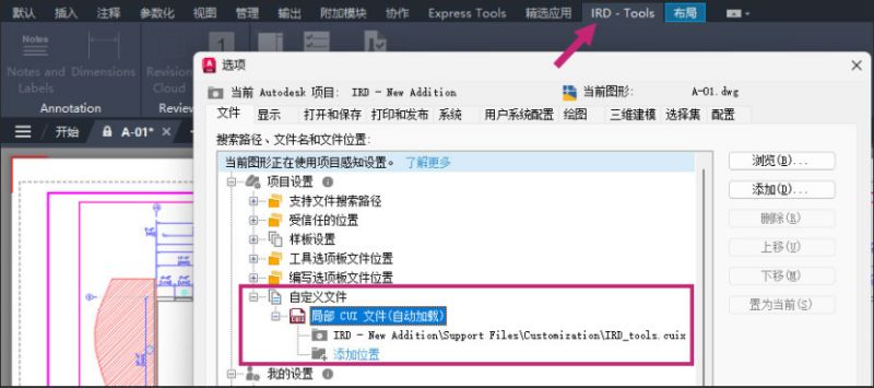 在 Forma Data Management 中配置 Autodesk 项目时,可以指定局部自定义 (CUIx) 文件,这些文件包含要在打开该项目中的图形时自动加载的自定义工具。在图形之间切换时,为 Autodesk 项目配置的任何 CUIx 文件会在其关联图形为当前图形时自动加载,而当与该 Autodesk 项目不关联的其他图形成为当前图形时,将卸载这些文件。有关设置 Autodesk 项目以使用连接的支持文件的详细信息,请参见设置 Autodesk 项目以使用连接的支持文件的步骤。