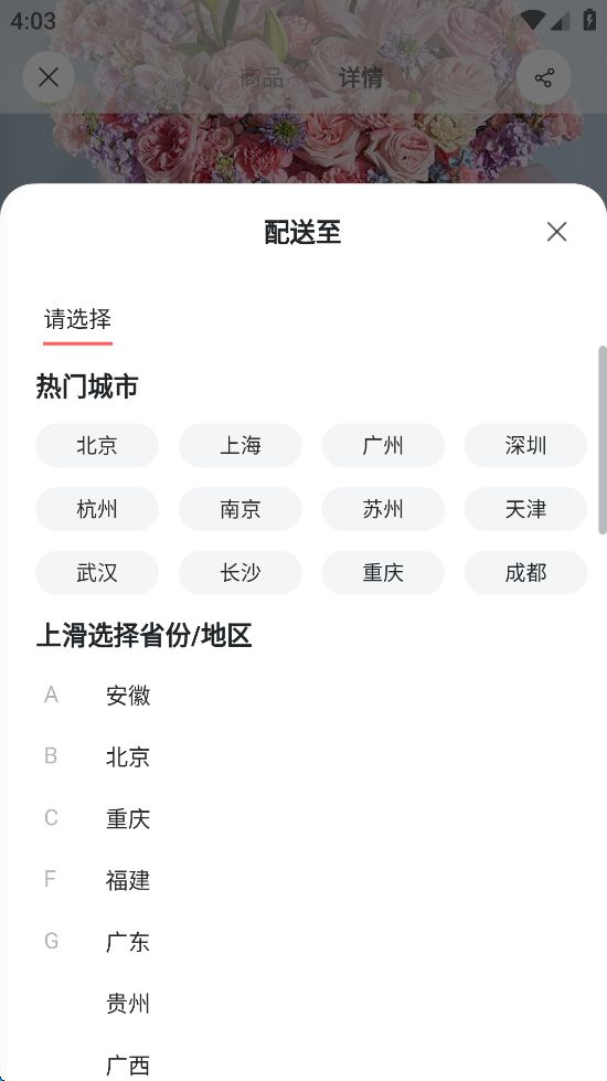 4、选择城市,尽量选择热门城市,部分城市无法配送。