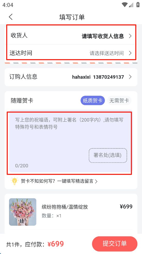 6、点击上方的“收货人”和“送达时间”填写相关信息,以及填写下方的“随赠贺卡”。