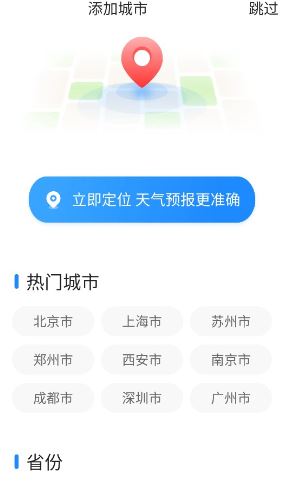 1、首次进入可选择城市或点击“立即定位”获取天气信息。