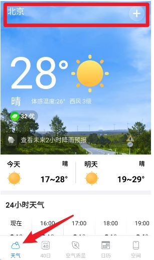 2、天气首页展示当前城市气温、天气状况与实时变化信息。