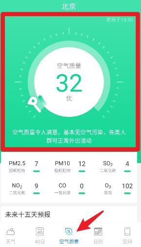 4、点击“空气质量”查看PM2.5等指标与户外活动建议。