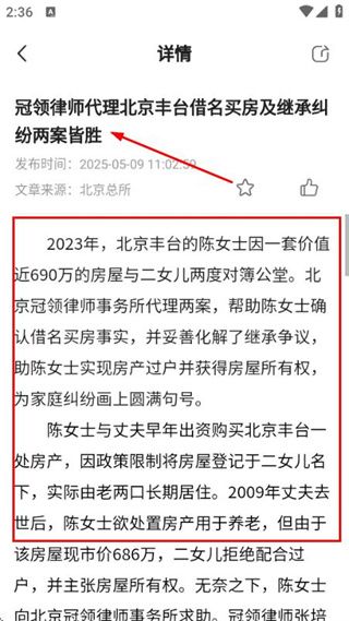 2、在房产纠纷页面点击目标案例,进入该案例的详情页面。