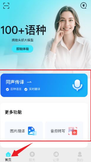 3、进入到软件首页,如图所示。这里提供了同声翻译,图片翻译以及音频转写等功能。