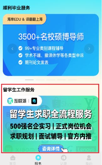 4、【服务】中则还提供了留学生求职全流程服务