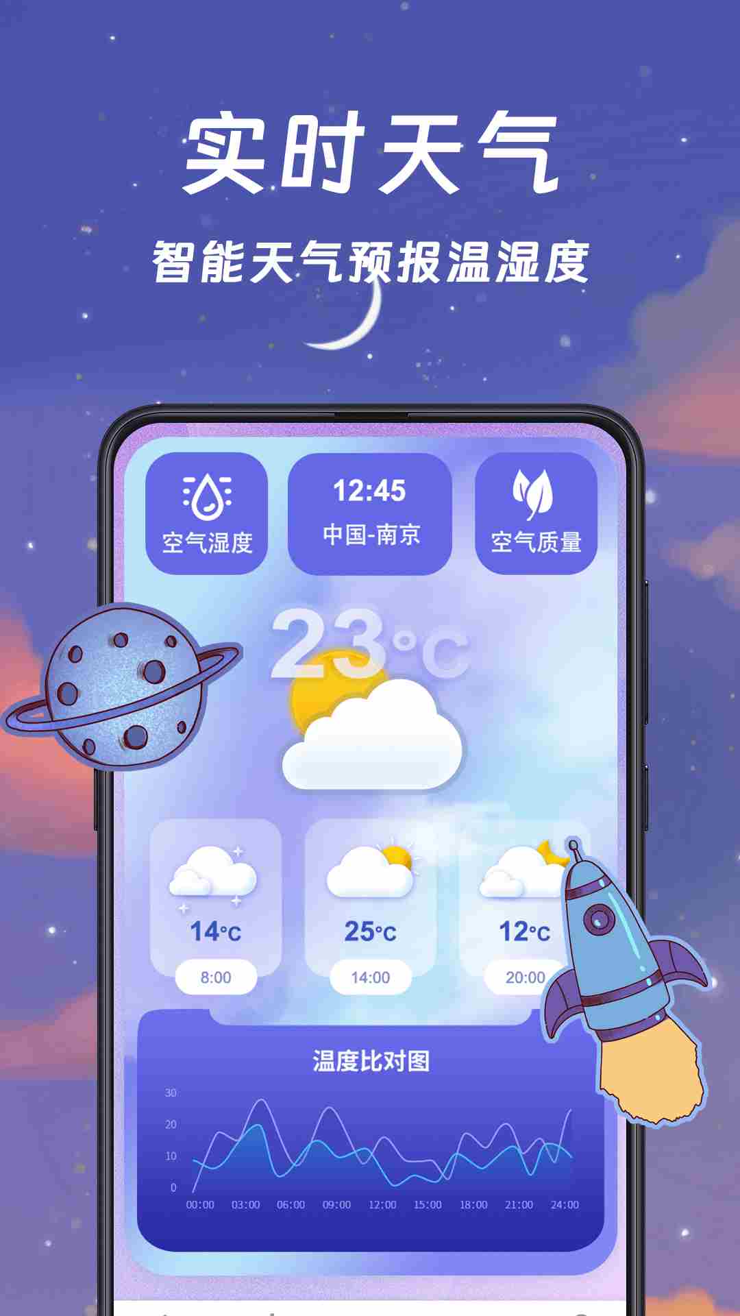 空气湿度、空气质量一目了然。天气测量首页我们设置了一天中未来24小时的3个时间段,让你更好的掌握一天的温差,出行穿衣带伞洗车更好参考。同时将未来5天的最低和最高天气温度进行对比,让你短期出行更便利。还可点击城市设置他们城市,以及或者更多的天气等其他信息。