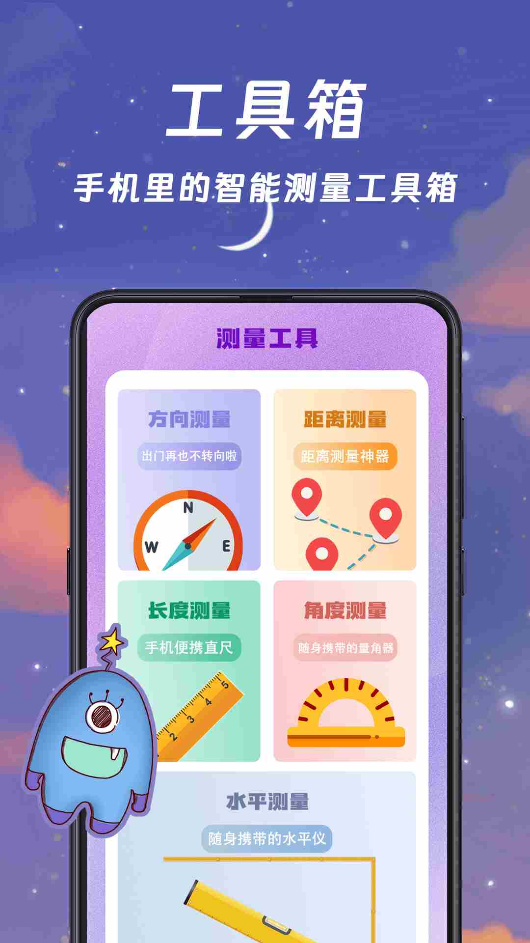 提供测距、直尺、尺子、角度测量、水平测量、指南针等多功能测试工具。 测距仪可测量身高、远方建筑高度一测便知,方便简单。 指南针:出行导航方向,不再担心会迷路,还有经度纬度海拔气压等数据。 尺子:把手机变成你的直尺,超方便。