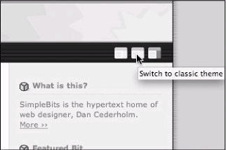 举个例子,在编写这段内容时,我的个人网站提供了三种不同的配色方式,每种配色都能通过点击图标,呼叫Paul Sowden的script工作,第一个图标是预设值,而第二个,第三个图标则是两个提供不同配色方式的替换样式表(图10-4).