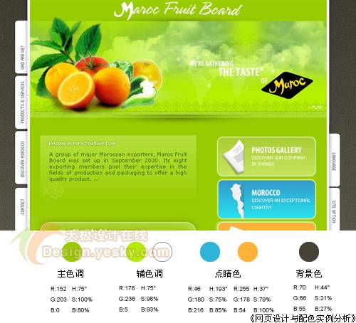 HSB数值H显示60度为正黄色,该主、辅色调只向绿色倾斜了一丁点–H为75度。大面积明度稍低的黄绿色为主要色调,饱和度却非常高,达到了100%,辅助色使用了提高明度的嫩绿色和白色,这两种辅色除了增加页面的层次感的同时,还能让整个页面配色有透亮的感觉,增强了绿色的特性。背景深褐色无疑把前景的所有纯色烘托得都耀眼于舞台上。