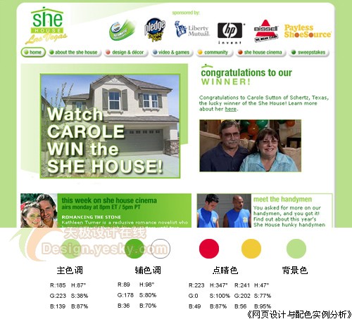适当运用不同纯度的不是相当严格意义上的对比色系组合时,通常能起到的主要作用是主次关系明确。不”标准”的对比色系对比特性虽然减弱,页面色彩看起来容易协调、柔和,但一样能突出主题。→ 同类色浅绿色网页例图 :http://shehouse.we.tv