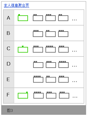 既然主人页面中有个“日志”,社区平台也有个“日志”,那就合并成一个好啦。“我自己”就没啦,全部的构架就只剩下一个按内容分类的结构了。因为主人的信息是打散到各个ABCD…栏目中,这就需要给主人一个自己有关所有自己的聚合页面—主人的首页。方便用户查看所有与自己有关的所有信息: