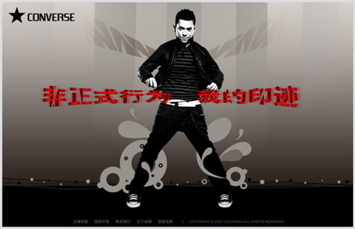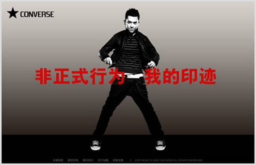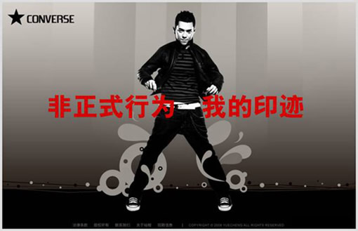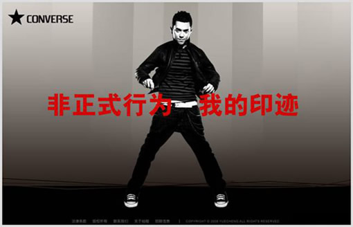 风格定位:CONVERSE是一个非常个性的服饰品牌,从它的官方网站中我们可以看到,设计非常个性,代言人也是特意选择很有个性的摇滚乐明星,所以,设计定位要体现其个性的风格;