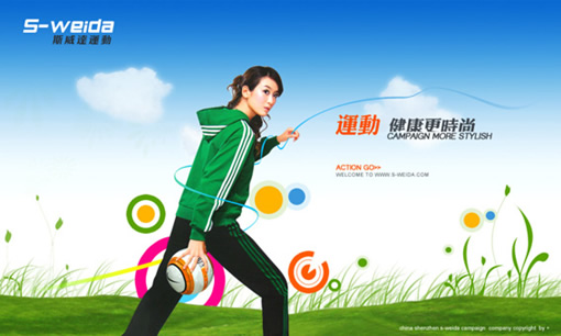 这里根据人物动作造型和画面空间考虑修饰,使用类似翅膀的造成,这样可以衬托产品自由休闲的特性,又给人视觉上的不同;但是这里并没有使用真实的翅膀,而是象形的元素;使用真实的翅膀容易显得太具象,与画面风格不符合;当然也可以使用画出来的翅膀,只要你能画!